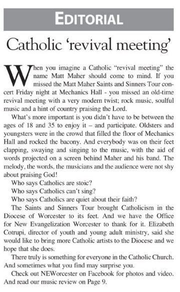 This is the article I wrote for the Catholic Free Press about the Matt Maher concert at Mechanics Hall in Worcester, MA on Friday, October 16. The paper’s editor attended the conference and was so impressed that she dedicated an editorial to it: