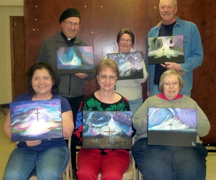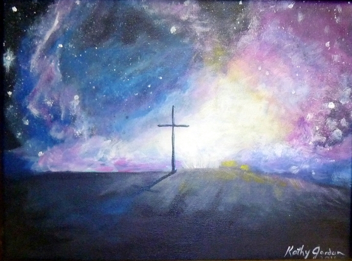 Starting with the same small black canvas, she began to paint Christ’s cross against the backdrop of a dramatic sky in front of the class, giving general instruction as to what we should paint and teaching us simple techniques. The directive was clear: this was to be our own painting. It would only resemble what she did; we were not to try and make an exact copy. Prayer would help us to overcome any inhibition and allow the Holy Spirit to take over our painting.