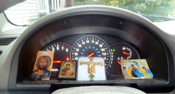 The dashboard contains various pictures and icons that I can gaze upon. God has gifted me with a long commute – two hours each day of time alone. Here I can pray, reflect and sing. And often I end up brainstorming as well. It’s not only a prayer space but a creative space.
