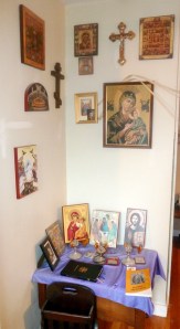 Here my husband, a deacon in the Melkite church, has set up his icon corner. Each morning he faithfully prays the First Hour of the Office, also known as the Liturgy of the Hours. I marvel at how he prays the same prayers every morning and frequently experiences new insight. He’s been praying those same prayers for close to ten years.
