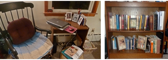 On my small desk is a picture of my favorite author, Louisa May Alcott, plus 2 paintings by her younger sister May. Sitting at the desk and working from my laptop, I can see my bookcase dedicated to all things Alcott plus the birds at the feeder outside the large window. Lots of writing has been done in that space.