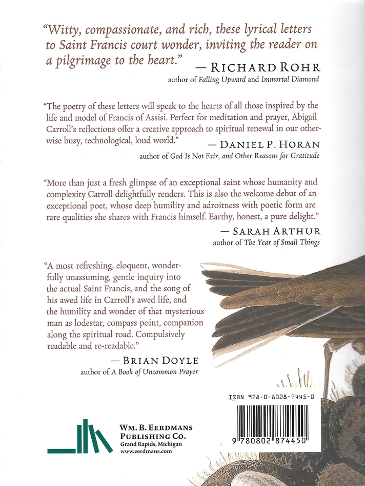 I cannot judge Abigail Carroll as a poet as I have no point of reference. What I can say is that her lines moved me. More than half the book has turned-down page corners to mark poems that struck a nerve. Her writing is accessible to anyone whether or not you are a poetry connoisseur. She addresses her poems as letters to someone who is on the minds of many because of his namesake, Pope Francis.