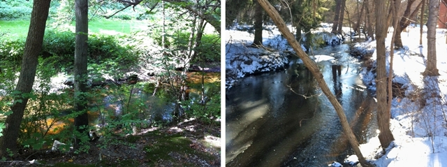 There is a greater force in the flow of the water because of the melting snow. At times it nearly rushes despite the small size of the brook.