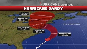As a weather nut, Hurricane Sandy is a fascinating thing to watch even as I wait nervously for her arrival. I live in Central Massachusetts and as you can see on the chart, we are going to get hammered.